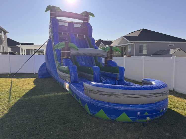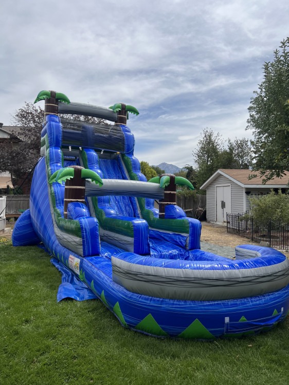 18 feet tall, practically new slide....... means super fast, try it for a fun thrilling ride and great for any party