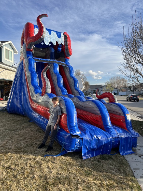 this 19 feet high and 35 feet long is an amazing slide with an intence slide straight into a pool and its cool battle of the sea's ocean theme will be the highlight of your party. this unit can be used wet or dry.